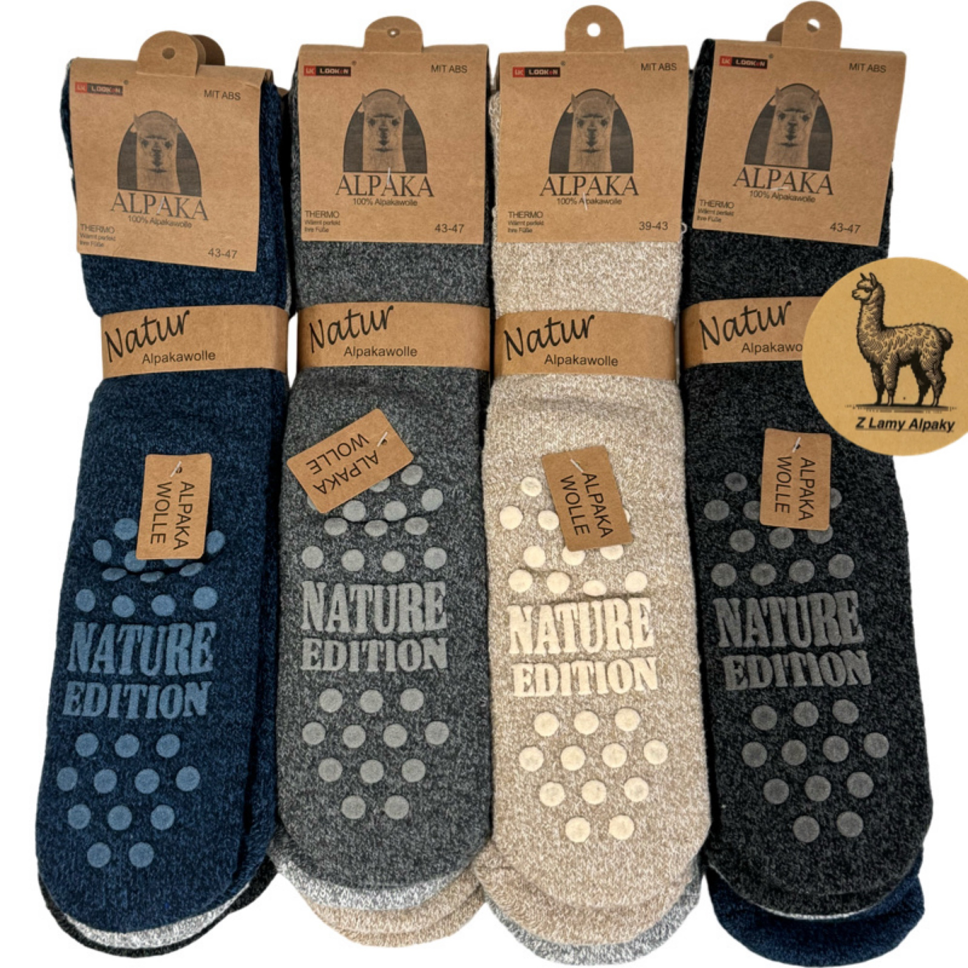 Pánské termo ponožky z 100 % alpaka vlny přinášejí luxusní hřejivost, jemnost a přirozenou prodyšnost. Spodní strana je opatřena protiskluzovou podrážkou – gumovými puntíky, které zvyšují stabilitu na hladké podlaze. Díky tomu nemusíte doma nosit bačkory – stačí obout tyto ponožky a užít si teplo i bezpečí.